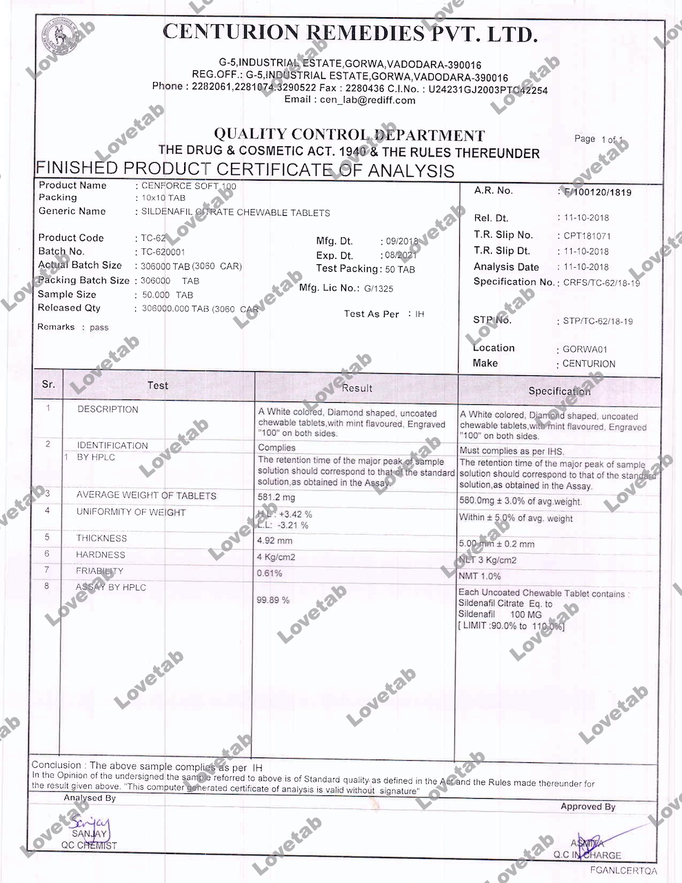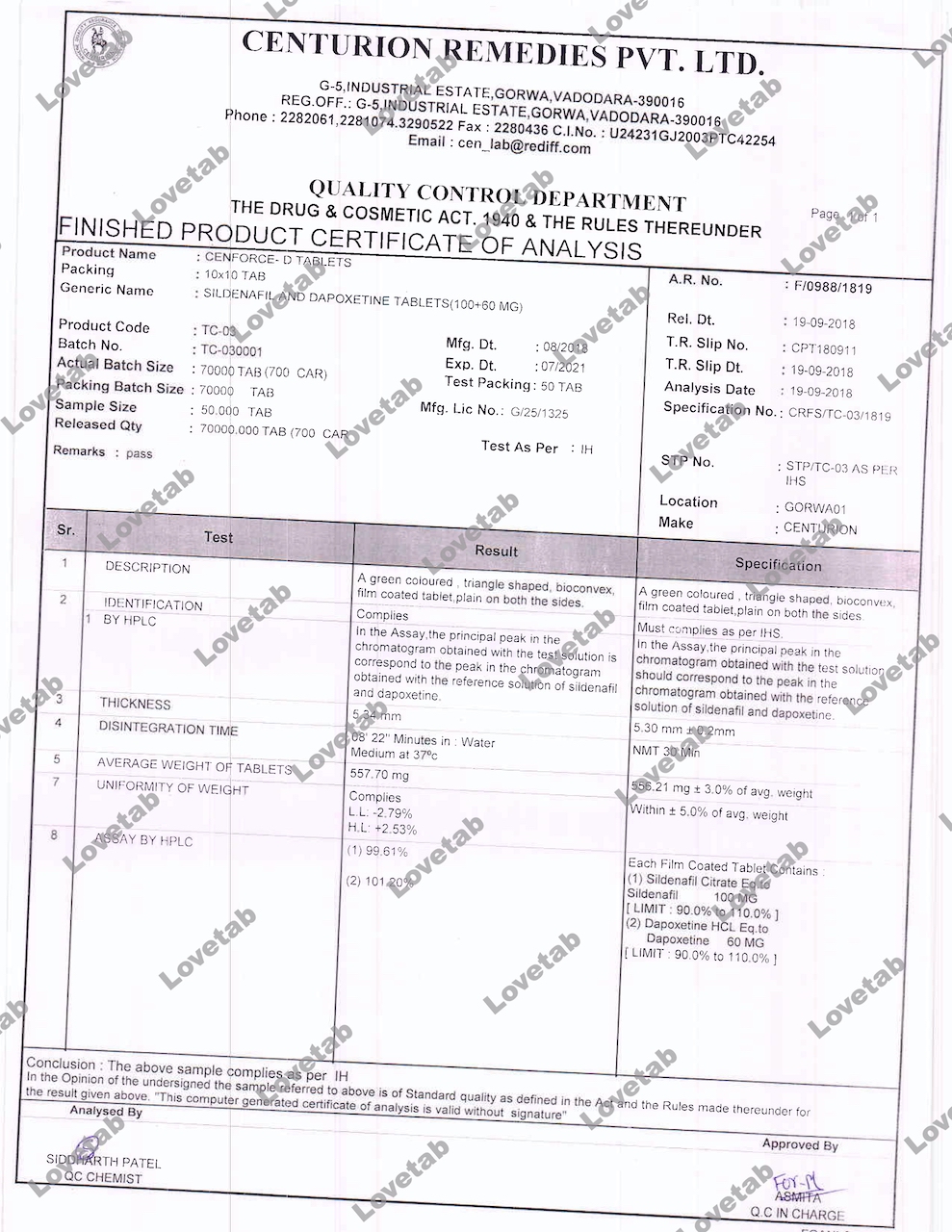 Сертификат на таблетки Супер Пфорсе (Силденафил и Дапоксетин)