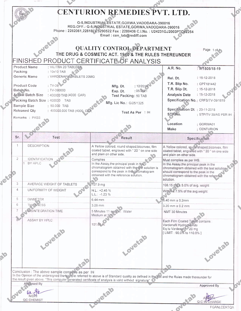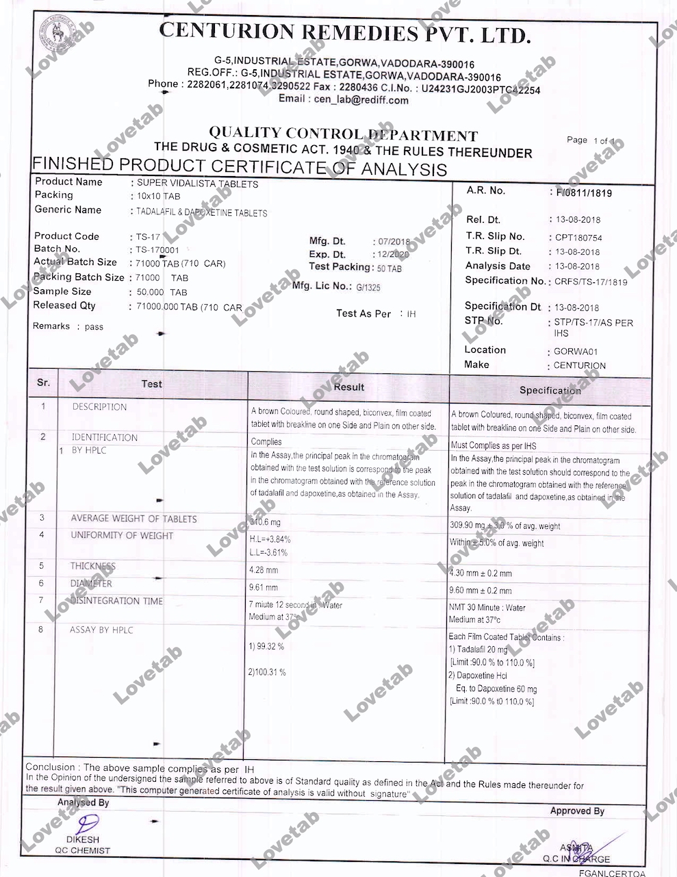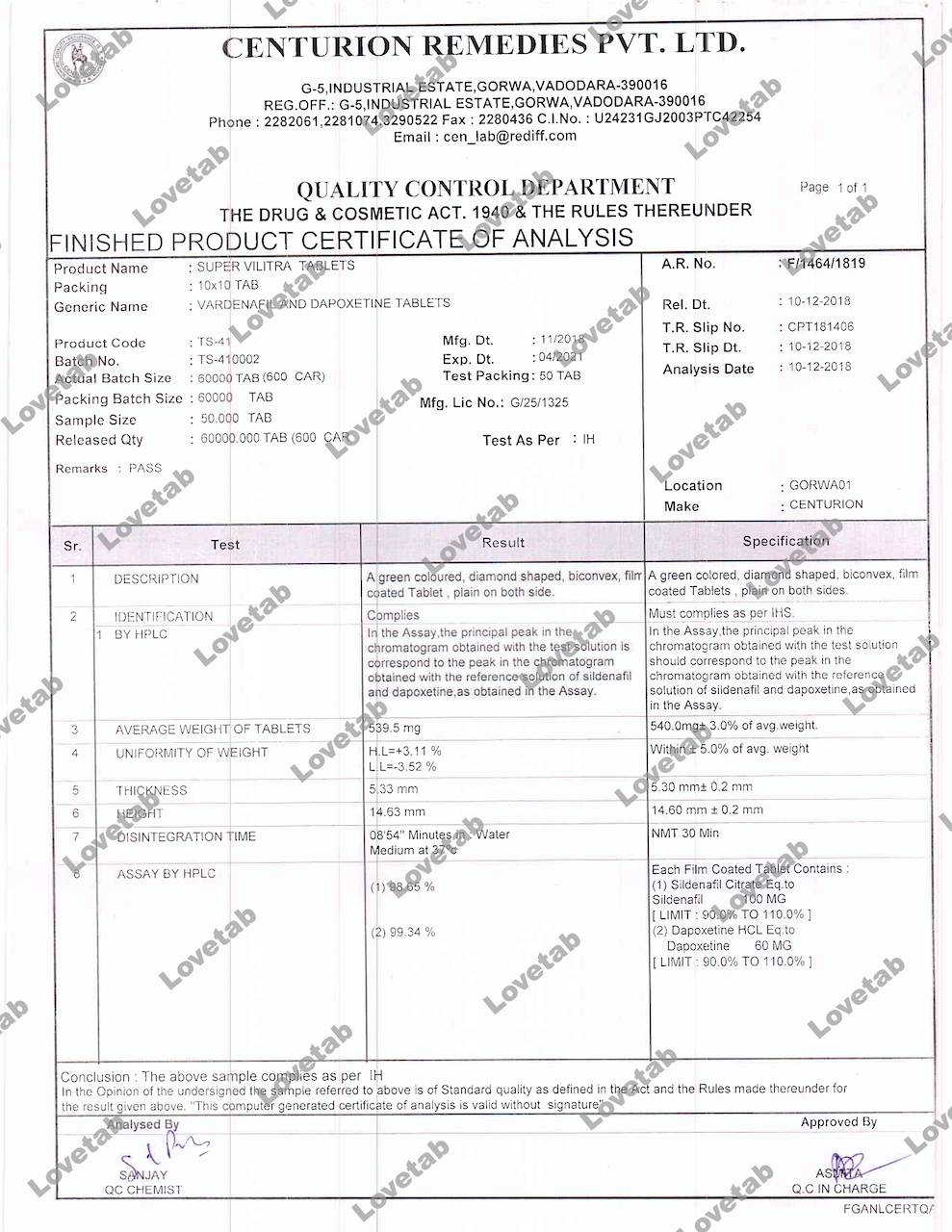Сертификат на таблетки Супер Левитра (Варденафил и Дапоксетин)