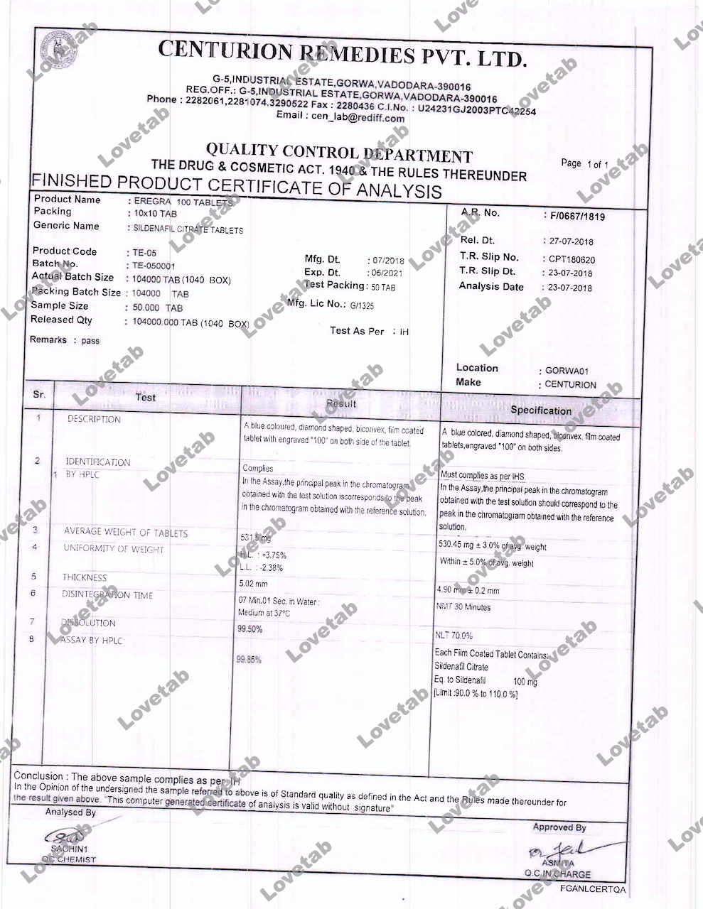 Сертификат на таблетки Виагра (Силденафил)