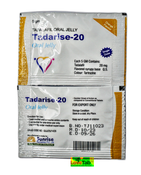 Ароматный и сладкий гель с Тадалафилом Tadarise Oral Jelly 20 улучшает потенцию и повышает качество секса. Препарат принадлежит к серии медикаментов Tadarise, представленных на рынке фармацевтической компанией из Индии Sunrise Remedies Pvt. Ltd. Тадарайз Гель поступает в продажу в порционных пакетиках.